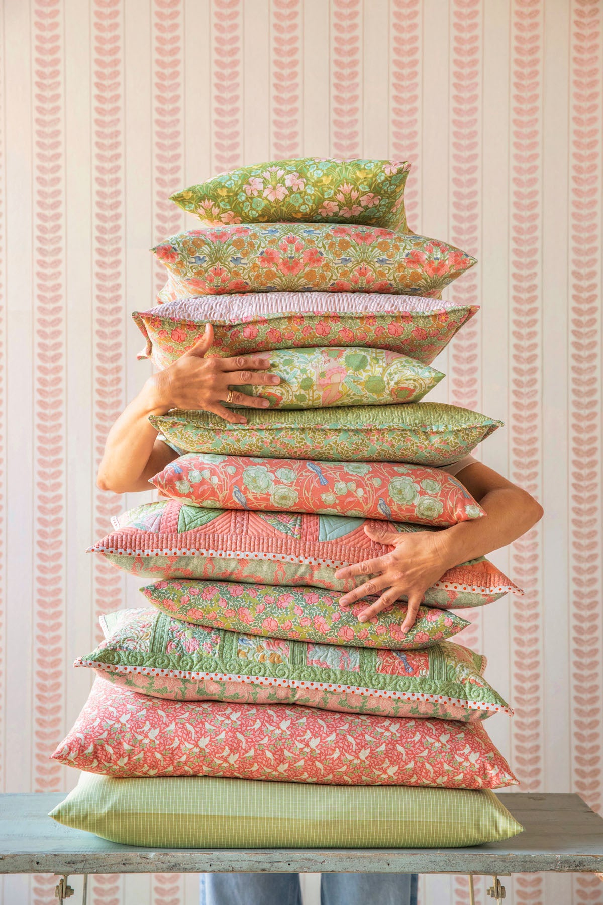 This lovely pillow featuring a single butterfly block uses fabrics from the Songbird fabric collection plus some from the Creating Memories collection. The pillow is perfect on its own but is also ideal to accompany the Mosaic Butterflies quilts. This pillow uses mainly coral colours but there are three other pillows in green, blues and yellows.