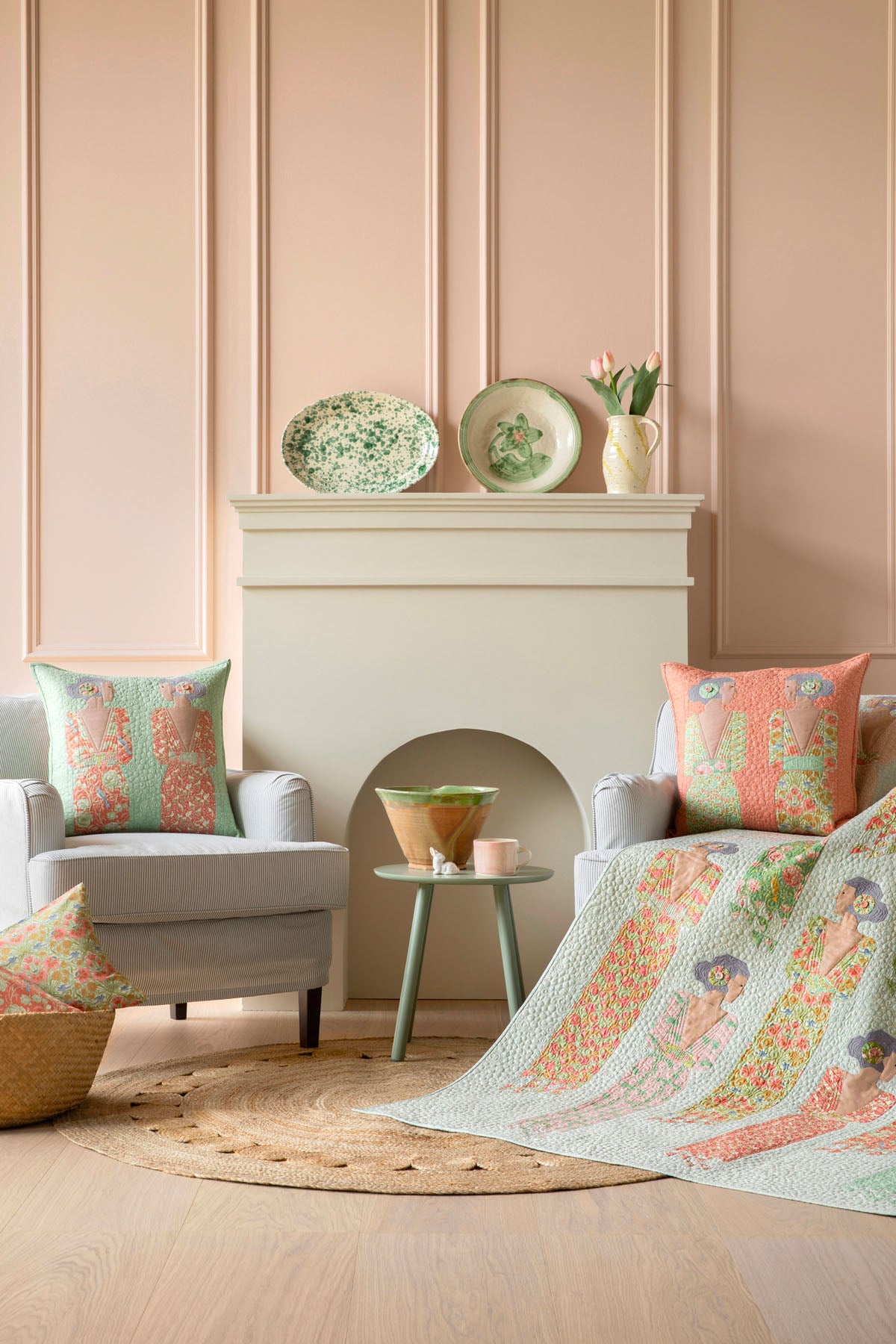 Pillow Kits come complete with backing and binding fabrics, just add optional lining fabric 21in (53.5cm) square, Wadding (batting): 21in (53.5cm) square and Five buttons (optional) Songbird buttons 16mm coral/green (TD400074) for the back of the pillow and Two buttons for hair ornament Songbird Buttons coral/green 16mm (TD400074)
