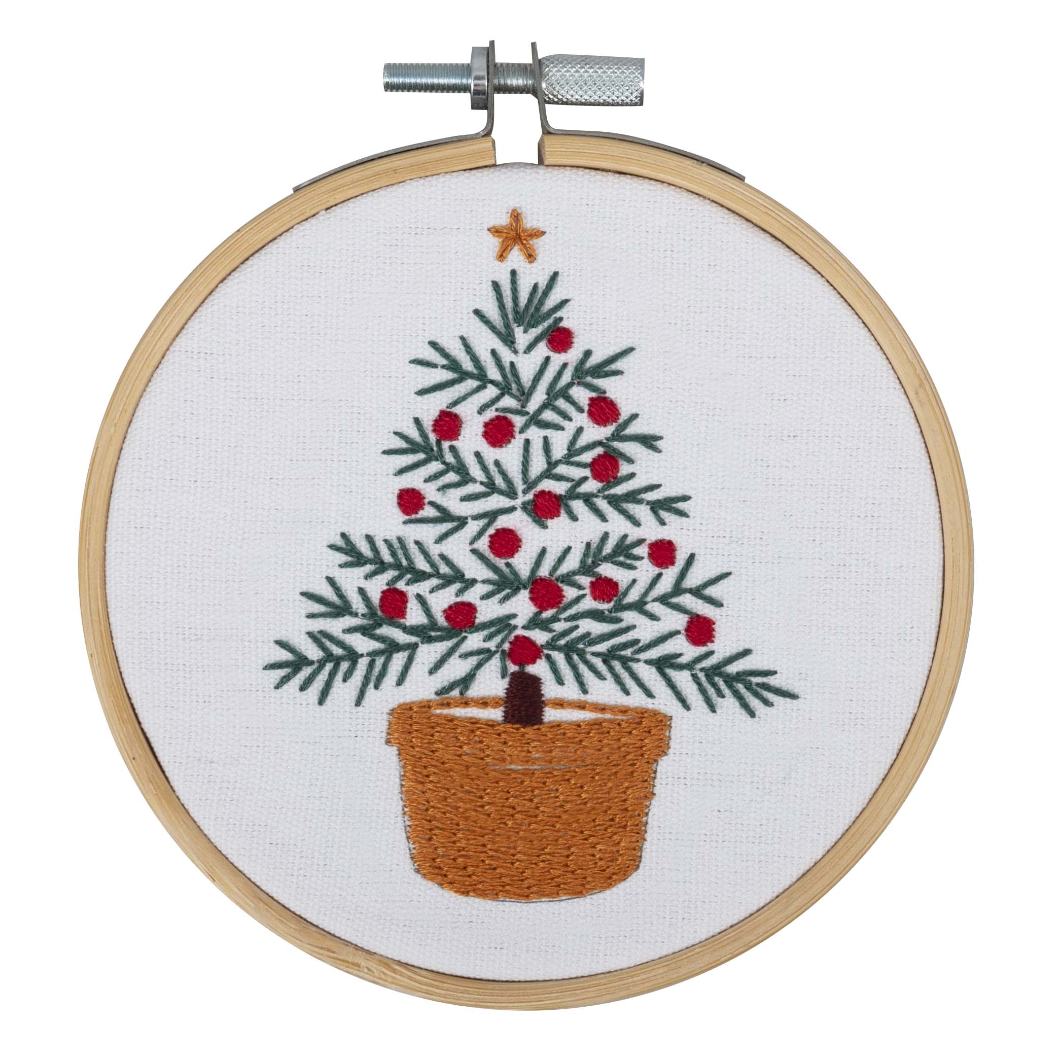 Kit Includes: Kit Includes: 10cm bamboo hoop; 6 stranded embroidery threads; 1 x metal embroidery needle; 15 x 15cm cotton fabric with pre-printed design; felt backing and full colour instruction sheet.